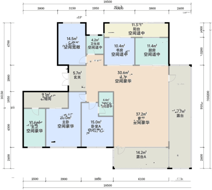 大平层户型作为项目的高端旗舰产品,以 “极致奢适、全景视野” 为设计目标,面积广阔,功能齐全,为高端客群打造专属的品质生活空间。户型采用全明通透设计,每个房间都有独立的采光面,客厅采用横厅设计,面宽可达 10 米以上,搭配全景落地窗,视野开阔无遮挡,将周边自然生态景观与社区园林景观无缝衔接,营造出 “客厅即观景台” 的居住体验。空间布局上注重圈层社交与家庭互动,客厅、餐厅、厨房采用 LDK 一体化设计,形成开阔的公共活动空间,适合举办家庭聚会、朋友宴请等高端社交活动;公共区域还规划有茶室、雪茄吧、影音室等功能空间,满足高端客群的多元化社交与休闲需求。