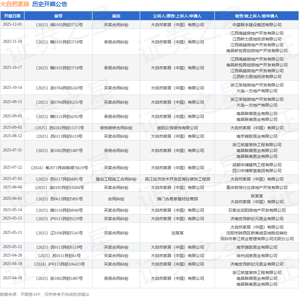 依据计算,近一年内以大自然家居(我国)有限公司为当事人的前史开庭公告有52则,其间案由为“生意合同纠纷”的公告以33则居首,其次为“承包合同纠纷”有8则,“装饰装饰合同纠纷”有4则。前史开庭公告(前20条)如下: